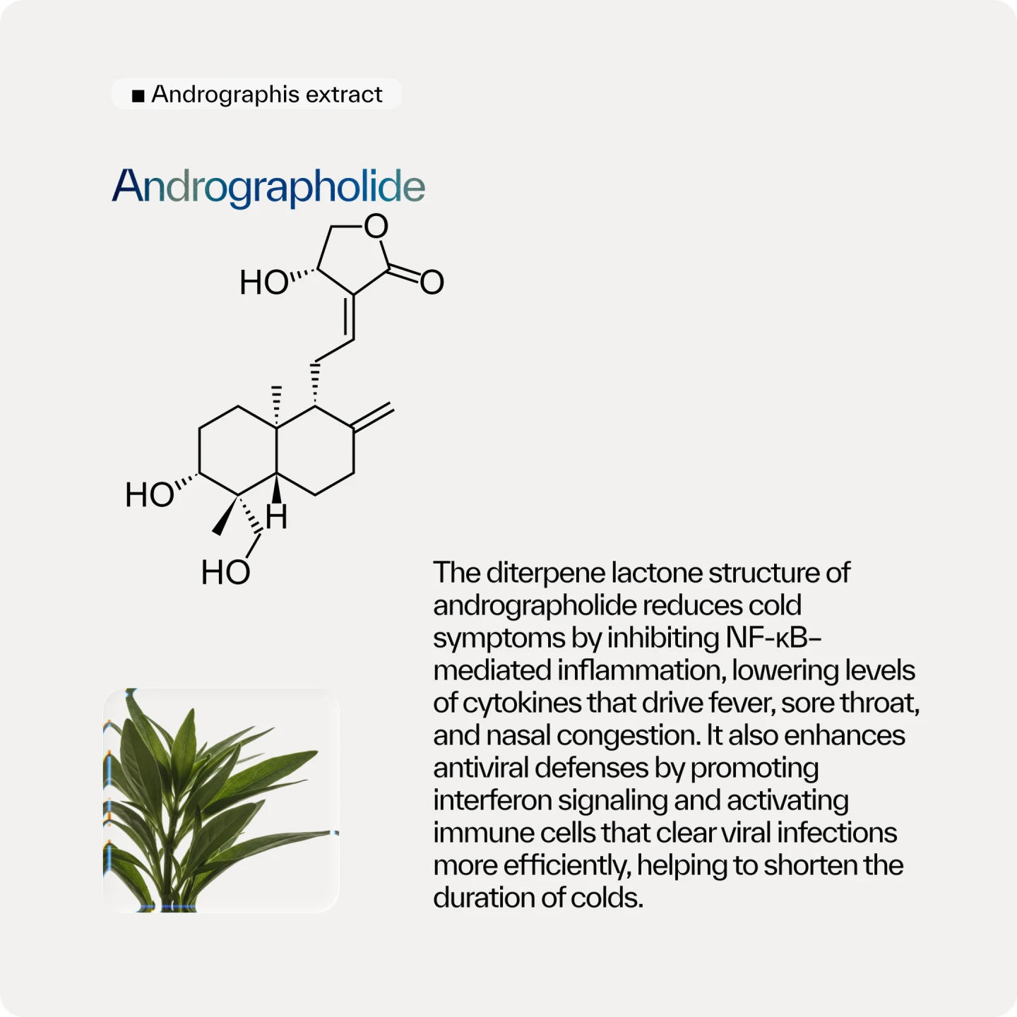 Clinically-dosed formulation combining rapid-onset relief ingredients with immune support compounds for comprehensive relief and defense.